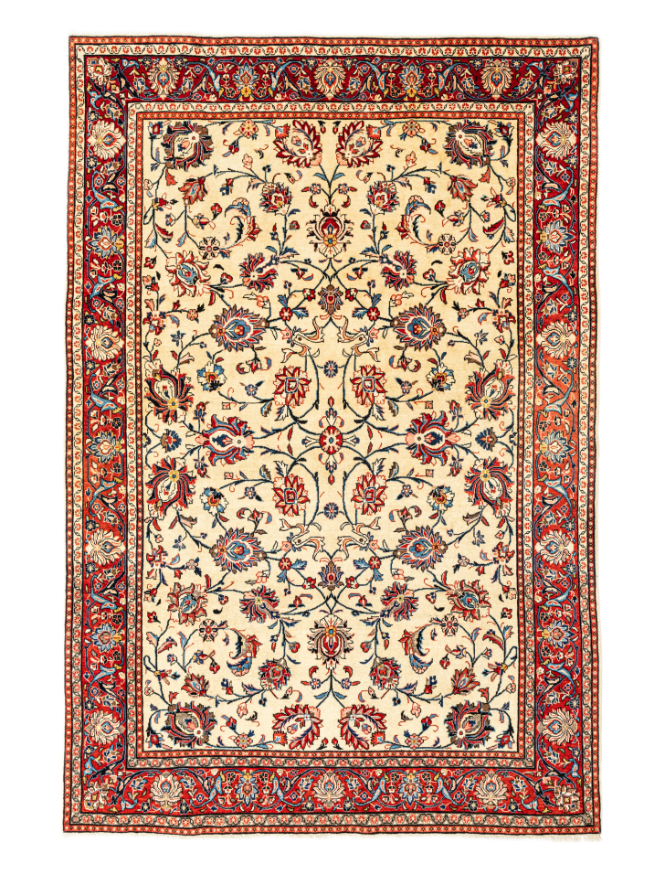 Dieser Saruk, der aus der Region um Arak stammt, zeichnet sich durch eine sehr gute Wollqualität und seine hohe Strapazierfähig aus. Kette und Schuss sind aus Baumwolle gefertigt, für den Flor wurde Schafwolle verwendet, die mit dem persischen Knoten verarbeitet wurde. Der Teppich wurde nicht restauriert und befindet sich trotz seines Alters in einem ausgezeichneten Zustand.